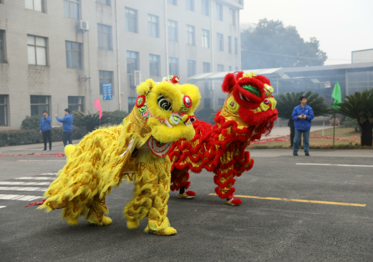 現場,一條長約十余米、火紅色的龍在空中不斷翻飛,舞龍的師傅們個個精神抖擻,步伐矯健,伴隨著激昂的鼓點,迎合著現場的鞭炮聲和歡呼聲,先是在公司門口,隨后隊伍從精密車間到鑄造車間,再到新辦公樓,獅龍環廠一周,每到一個車間,各車間早已準備好鞭炮,歡迎著象征吉祥如意的獅龍!
